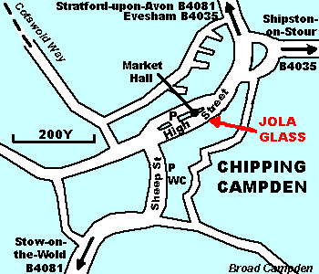 The Jola Glass Studio is opposite the Market Hall, in the old Police Station with the Tourist Information on the High Street of Chipping Campden, a beautiful Cotswold town in rural Gloucestershire. | ||||||||